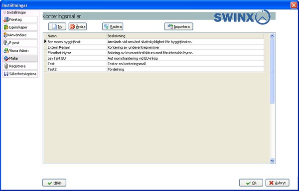 Har man skapat konteringsmallar i Visma Administration kan man importera de till SWINX ScanLev. Flertalet mallar blir användbara direkt utan några redigeringar, men vi rekommenderar alltid en genomgång och kontroll innan man börjar använda mallarna i SWINX ScanLev. För att starta importen klicka på knappen "Importera". Därefter markerar man önskad mall, klickar på kontrollera-knappen och väljer därefter OK. Varje mall får alltså importeras separat.