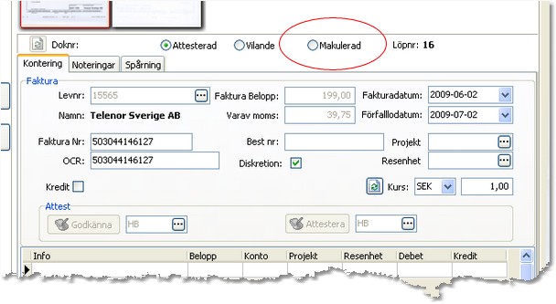 Komplettera gärna med att välja fliken Noteringar och skriv in varför fakturan makulerats.