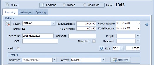 •Eftersom man kan godkänna fakturan på radnivå i konteringsfältet kan man dela upp beloppet på flera konteringsrader (med eller utan projekt och resultatenheter) så att användarna sen kan godkänna en egen rad.