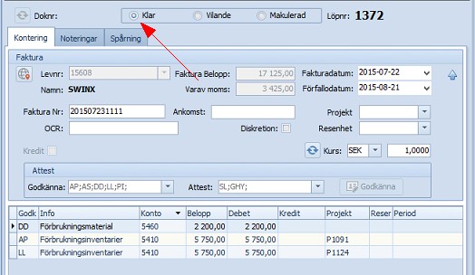 Även DD godkänner men på radnivå och väljer därefter att spara (högst upp), vilket måste göras om man inte godkänner hela fakturan. Man ser i fältet att användarna försvinner vartefter de godkänner och kvar är nu AS;AP och LL. Vill man veta vilka som redan har godkänt fakturan, klickar man på pilen till höger i fältet för godkännare och i listan till höger för valda godkännare ser man med normal text de som ska godkänna och den som redan godkänt står med grå text. Under fliken spårning ser man historiken som finns och vem som bearbetat fakturan. Vad som mer syns under denna flik kan man läsa mer om i hjälpavsnittet spårning.