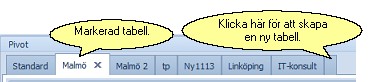Från början finns det en pivåtabell (Standard) och ytterligare tabeller kan skapas genom att klicka i den blå rutan längst till höger i rubrikraden. Byt namn på en tabell genom att markera den, högerklicka på tabellnamnet och välj Byt namn. För att radera en tabell, välj istället Radera eller klicka på krysset till höger om tabellnamnet. Tabellerna är låsta i den ordningen som de är placerade.