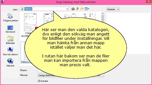 Väljer man Visa så kan man även importera valda filer från mappen/katalogen. Välj fil genom att klicka på en enstaka fil eller markera flera filer (håll nere Ctrl och klicka). Vill man hämta fakturor från en annan mapp än den ordinarie klickar man sig fram till den mapp man vill hämta fakturorna ifrån. Mappen visas i fortsättningen som standardförslag.