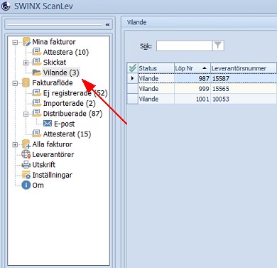 Om man registrerat en faktura som av någon anledning inte ska bearbetas vidare just nu kan man sätta den som vilande. Det kan t.ex. gälla en faktura som man väntar en kredit på. Genom att klicka i Vilande i samband med att den registreras eller bearbetas, kommer den att behandlas separat tillsammans med övriga vilande fakturor. Vilande-funktionen finns tillgänglig hela tiden i statusfältet, ända fram till att fakturan ska överföras till affärssystemet.