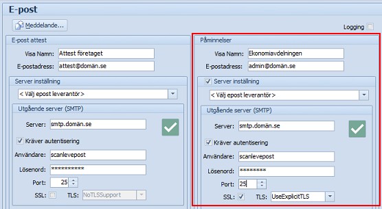 Uppgifter om vem eller avdelning och den e-postadress som man vill ska stå som avsändare, ställer man in i fälten på höger sida som avser bara Påminnelser. Fyller man inte i fälten så används istället de inställningar som finns på vänstra sidan, i fälten för Utgående server.