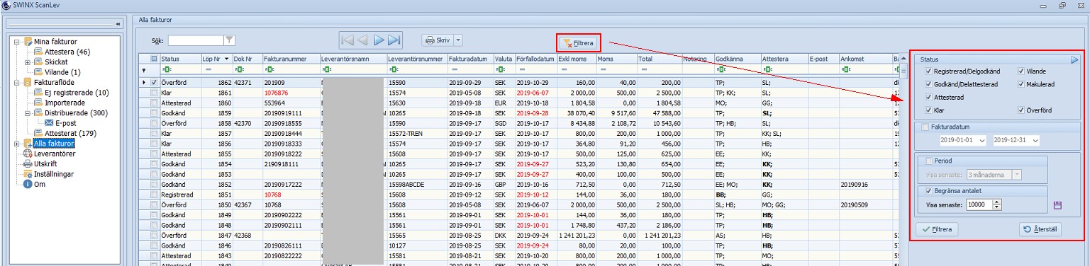 Dubbelklicka på önskad leverantör för att se en lista med den leverantörens fakturor. Även här finns knappen Filtrera för att göra ett urval.