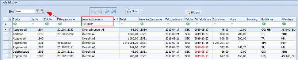 När man skriver in "ö" i sökfältet så markeras raden för den första fakturan i listan där leverantörens namn börjar på "ö". Anger man "över" så flyttas markören vidare till leverantören "Över och Under AB".