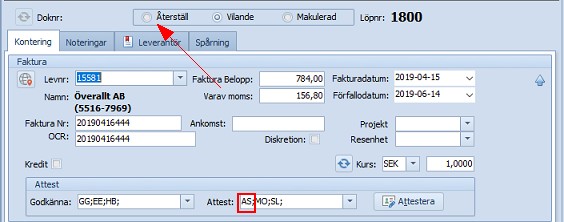 Fakturan är återställd från Vilande och har fått tillbaka statusen Godkänd, som den hade innan. Användarna ska nu attestera fakturan precis som vanligt.