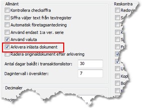 För att kopplingen ska fungera så bra som möjligt ska följande inställningar göras inne i Visma Compact. Under Register -> Företagsinformation ska Arkivera inlästa dokument markeras.
